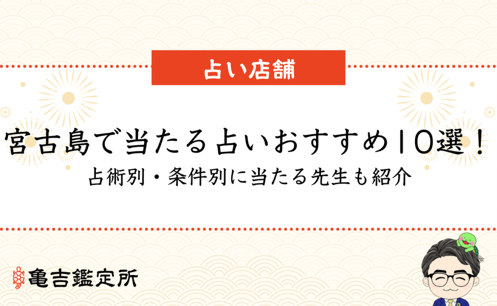 宮古島には信頼と実績のある占い師が多く、地元の人はもちろん観光客にも人気の占い店が点在しています。 しかし選択肢が豊富なだけに どの占い師に相談すれば良いの? と迷う人もいるでしょう。 そこで今回は、宮古島で「よく当たる」と評判の占い10選に... -